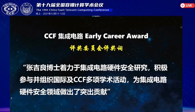 张吉良教授获得此项殊荣,CCF 集成电路 Early Career Award评奖委员会认为:“张吉良博士着力于集成电路硬件安全研究,积极参与并组织国际及CCF多项学术活动,为集成电路硬件安全领域做出了突出贡献”。本届CCF集成电路 Early Career Award赞助商为清华大学赛灵思AI研究基金和上海国微思尔芯技术股份有限公司。