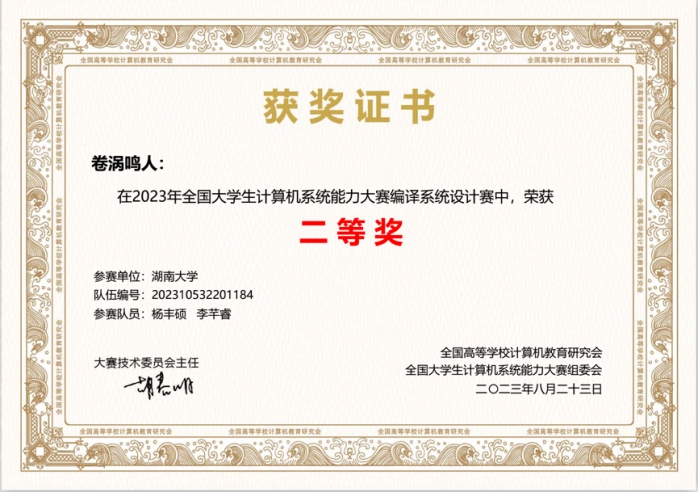 编译系统设计赛(华为毕昇杯)二等奖证书