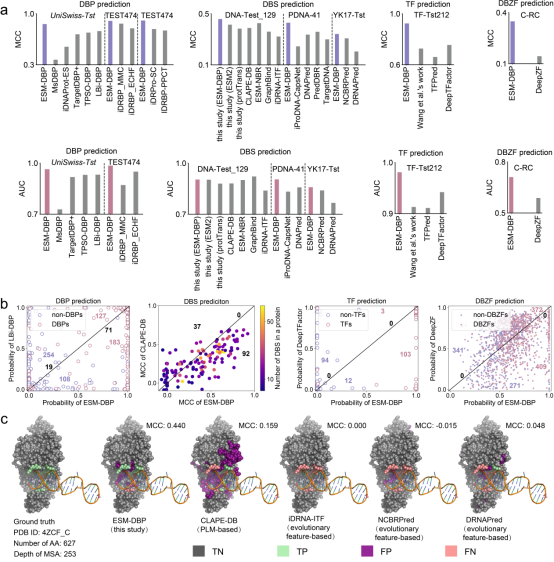结合蛋白质领域自适应蛋白质语言模型ESM-DBP,主要通过在通用蛋白质语言模型的基础上使用海量的DNA结合蛋白质序列进行掩码预训练,并在DNA结合蛋白质相关的四个下游任务上系统地评估了ESM-DBP的预测性能。在多个基准测试集上和现有预测方法的比较展示了ESM-DBP优异的预测精度。ESM-DBP还展现了在只有少量相似的同源序列的蛋白质序列上较好的预测性能,远远超过通用蛋白质语言模型和国内外其他预测方法,为解决在机器学习在低同源蛋白上的功能预测精度低这一痛点提供了新的视角。