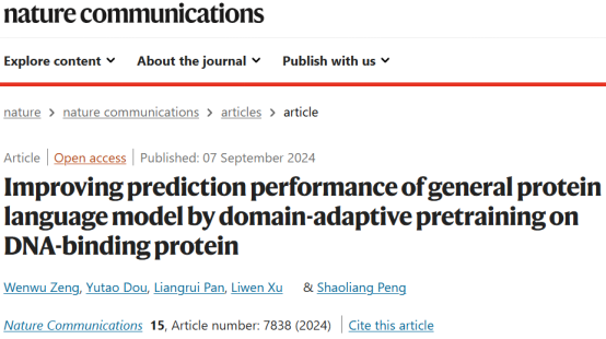 彭绍亮教授课题组在国际顶级期刊Nature Communications发表了题为Improving prediction performance of general protein language model by domain-adaptive pretraining on DNA-binding protein的研究论文。该研究提出了基于大型通用蛋白质语言模型和领域自适应预训练的DNA结合蛋白语言模型ESM-DBP,系统地研究了如何从蛋白质初级序列出发有效地预测DNA结合蛋白质和残基这一生物信息学和人工智能领域的挑战性问题,探索发现了基于大型蛋白质语言模型的高质量表征学习技术,为研究复杂的DNA-蛋白质相互作用机制提供了新的研究思路。