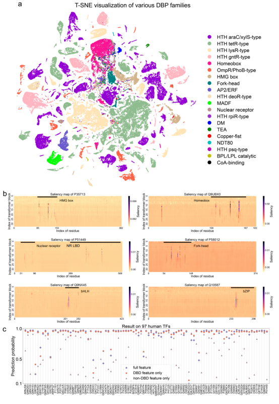 可解释性分析揭示了ESM-DBP对天然的DNA结合域的高度关注。
