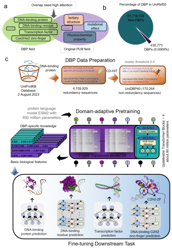 蛋白质和DNA相互作用在大多数生命活动中起到基础性的作用。传统的基于生物湿实验研究蛋白质-DNA相互作用的方法周期长、费用高,成功率低。在过去的十年中,基于深度学习的技术已广泛应用于蛋白质-DNA相互作用预测的研究中。然而,这些方法大多严重依赖于训练数据集中有限的初级序列和高质量的多序列比对信息,从而限制了它们的泛化性和准确性。大规模蛋白质语言模型的出现为克服这些限制提供了一个重要的机会。然而,该研究组经过调研发现国内外研究者使用的通用蛋白质语言模型没有特别关注特定功能领域(比如DNA结合蛋白质)的知识且通常缺乏可解释性。为了缓解这些痛点,团队提出了DNA