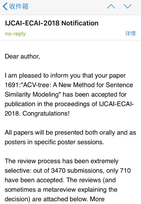 五月渐渐步入科研农民的收获季节。我院唐卓和全哲老师指导的硕士生乐雨泉的论文《ACV-tree: A New Method for Sentence Similarity Modeling》被2018年中国计算机学会(CCF)推荐国际学术会议IJCAI(International Joint Conference on Artificial Intelligence,//dblp.uni-trier.de/db/conf/ijcai/)接收,该会议是人工智能方面的CCF A类推荐会议,据悉,这是我院第一次有硕士生的论文被IJCAI ( CCF A类)会议录用。