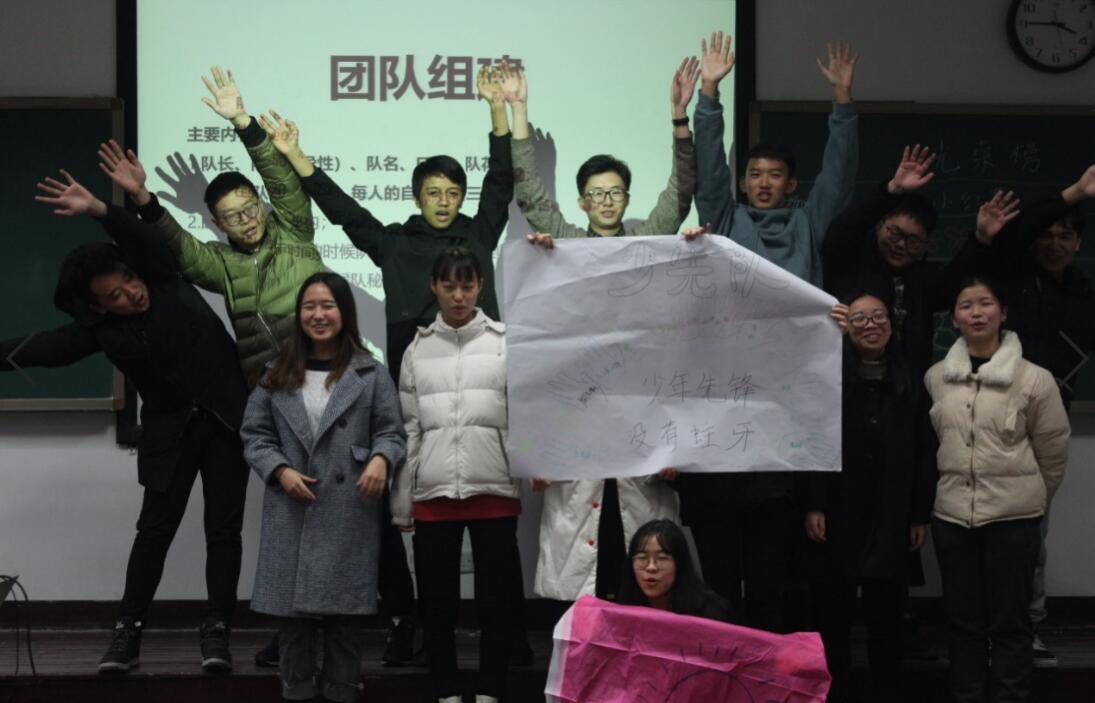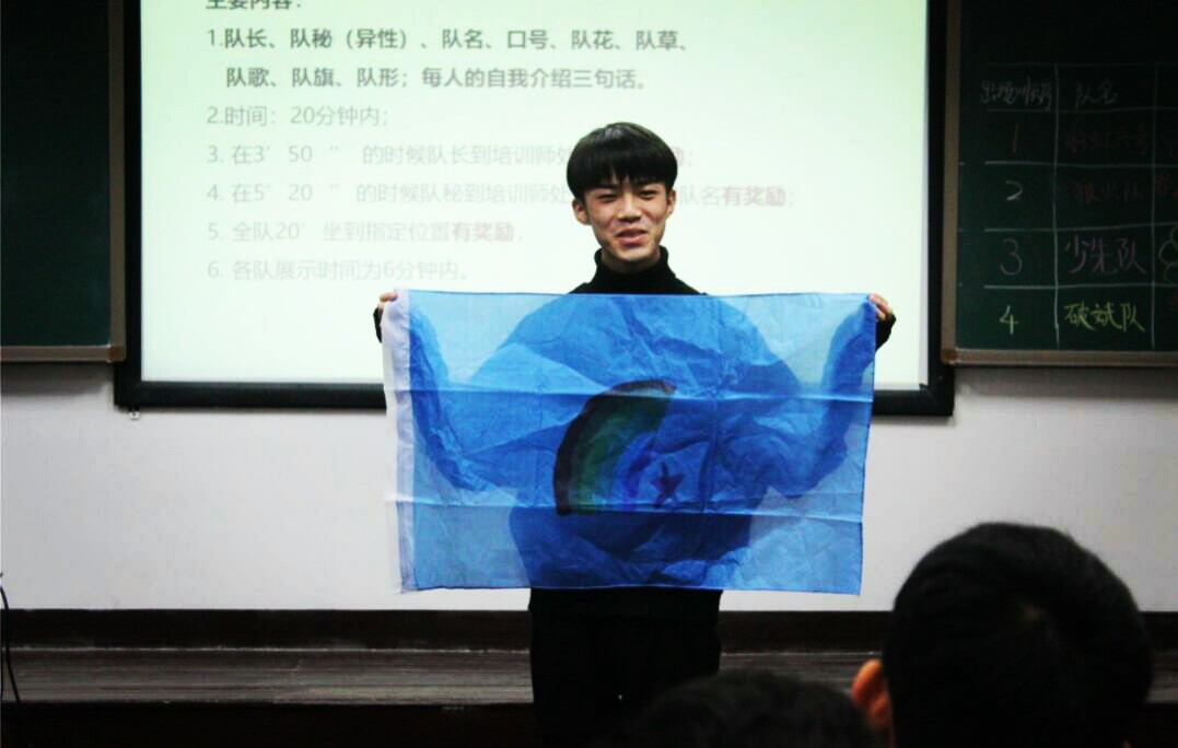 一场热身活动之后,同学们渐渐进入了状态,大家开怀大笑,不再有之前的紧张和羞涩。按照活动分组,潘老师让每一组队员选出了一名队长,并在队长的带领下全队合作,起好了属于自己的队名,创作了有本组特色的队旗、口号、队歌、队形。展示环节中,每一组全部队员上台做了简短的自我介绍,并展示本组的特色设计。在这一环节中,台下观众都被各组的精彩表现吸引了目光,欢声笑语中,每一组都收获了“爱的掌声”。