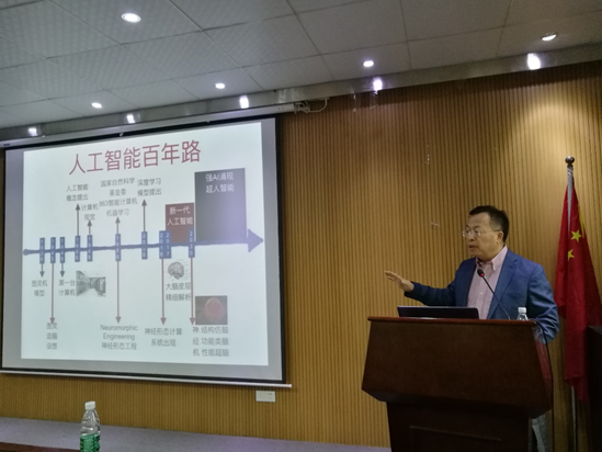 第二场报告,黄教授首先解释类脑计算的概念,指出它是计算机出现以来最大的一次革命,有望实现强人工智能(也称通用人工智能,AGI)。类脑视觉是按照类脑计算的思路实现机器视觉,是借鉴生物视觉系统的神经网络结构和信息加工机理而建立的一套新的视觉信息处理理论、技术、标准、芯片和应用系统。生物视觉信息处理机制优越,但受限于生理限制,视网膜发放神经脉冲的频率只有数十赫兹。团队研制的仿视网膜超速全时视觉芯片脉冲发放频率达到万赫兹,“超速”人眼百倍,能够“看清”高速旋转叶片的文字。“全时”是指从芯片采集的神经脉冲序列中重构出任意时刻的画面,改写了视频的概念,是实现真正机器视觉的基础,为无人驾驶、机器人、视频监控等领域带来重大变革。