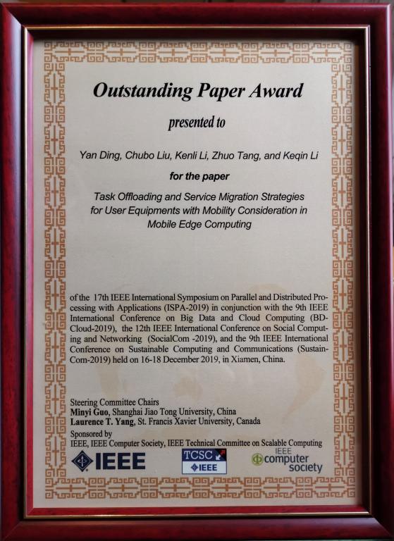 副教授刘楚波脱颖而出,荣获2019年“优秀青年学者奖”(IEEE TCSC Award for Excellence for Early Career Researchers-2019)。同时,其与所在的团队又共同荣获年会的“杰出论文奖”。