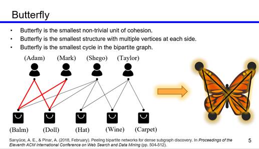 在学术报告中,王凯副教授首先通过生动的实例介绍了二部图的基础知识,包括其定义及应用场景。接着结合应用场景阐述了今天的主题报告所研究的问题,即二部图中的butterfly结构、k-bitruss结构的分解。
