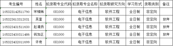 2023年硕士研究生复试录取工作实施细则》,经学院研究生招生工作领导小组审定,学院按专业初试+复试总成绩由高到低递补拟录取考生宋楠稀(考生编号105323142511790,拟录取专业电子信息软件工程,总成绩548.37),考生许奇(考生编号105323432011699,拟录取专业电子信息软件工程,总成绩527.17)。