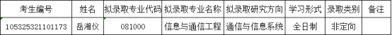 根据《亚洲av 2025年硕士研究生招生复试工作实施细则》,经学院审定,学院按专业初试+复试总成绩由高到低递补拟录取考生岳湘仪(考生编号105325321101173,拟录取专业信息与通信工程,总成绩513.00)。