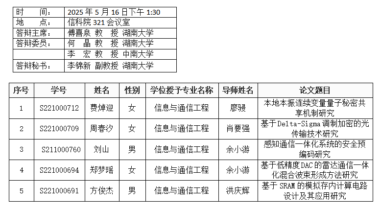 亚洲av (通信工程系)2025年5月16日硕士答辩公告
